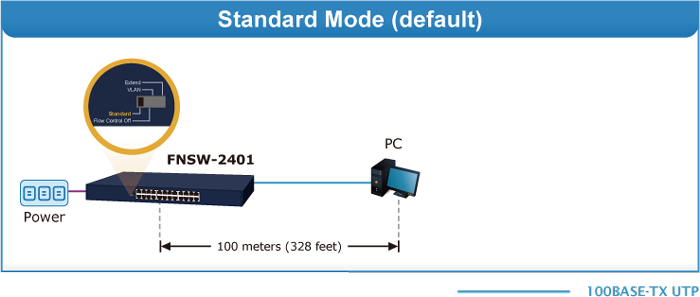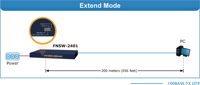 En el modo de funcionamiento "Extender", el FNSW-2401 funciona por puerto a una velocidad de funcionamiento dúplex de 10 Mbps, pero puede transmitir datos a una distancia de hasta 200 metros, superando el límite de 100 m del cable UTP Ethernet. Con esta nueva función, el FNSW-2401 proporciona una solución adicional para la extensión de la distancia, ahorrando así el coste de la instalación del cable Ethernet. Su función de aislamiento de VLAN aísla cada puerto para evitar tormentas de difusión y defenderse de la suplantación de DHCP en el modo de funcionamiento "Extender".