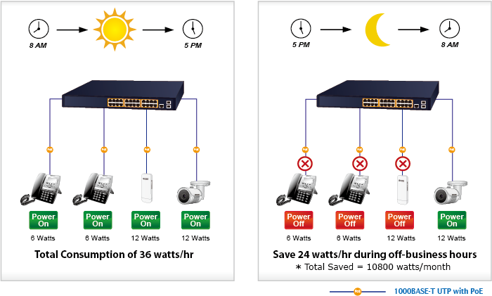 En el marco de la tendencia mundial de ahorro de energía y de la contribución a la protección del medio ambiente, el GS-4210-24P2S puede controlar eficazmente la fuente de alimentación, además de su capacidad de proporcionar una gran potencia en vatios. La función de "programación PoE" le ayuda a habilitar o deshabilitar la alimentación de energía PoE para cada puerto PoE durante intervalos de tiempo específicos y es una función potente para ayudar a las PYMES o empresas a ahorrar energía y dinero. También aumenta la seguridad al apagar los PD que no deberían estar en uso durante las horas no laborales.