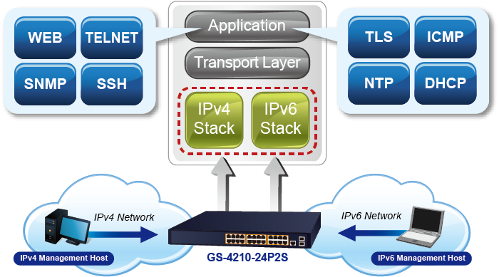Al admitir los protocolos IPv6 e IPv4, el GS-4210-24P2S ayuda a las PYMES a dar el salto a la era IPv6 con la menor inversión, ya que no es necesario reemplazar ni revisar sus instalaciones de red si se configura la red de borde FTTx IPv6.