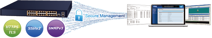 Además, el GS-4210-24P2S ofrece administración remota segura al admitir conexiones SSHv2, TLSv1.2 y SNMPv3 que cifran el contenido del paquete en cada sesión.