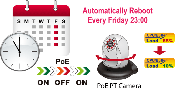 El GS-4210-24P2S permite que cada una de las cámaras IP PoE o puntos de acceso inalámbricos PoE conectados se reinicie a una hora específica cada semana. Por lo tanto, reducirá la posibilidad de que la cámara IP o el punto de acceso se bloqueen debido a un desbordamiento del búfer.