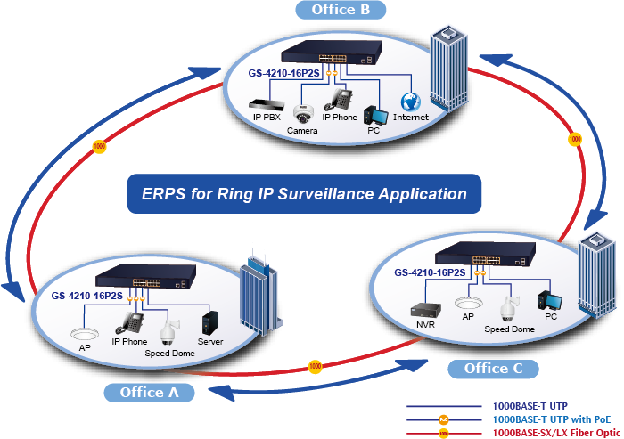 El GS-4210-16P2S admite la tecnología de anillo redundante y cuenta con una capacidad de autorrecuperación rápida y sólida para evitar interrupciones e intrusiones externas. Incorpora tecnología avanzada ITU-T G.8032 ERPS (Ethernet Ring Protection Switching), protocolo Spanning Tree (802.1s MSTP) en la red del cliente para mejorar la confiabilidad del sistema y el tiempo de actividad en varios entornos.