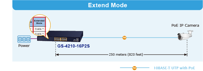 En el modo de funcionamiento "Extendido", el GS-4210-16P2S funciona por puerto a una velocidad dúplex de 10 Mbps, pero puede admitir una salida de alimentación PoE de 20 vatios a una distancia de hasta 250 metros, superando el límite de 100 m del cable UTP Ethernet. Con esta nueva función, el GS-4210-16P2S proporciona una solución adicional para la extensión de la distancia PoE 802.3at/af, lo que permite ahorrar el coste de instalación del cable Ethernet.
