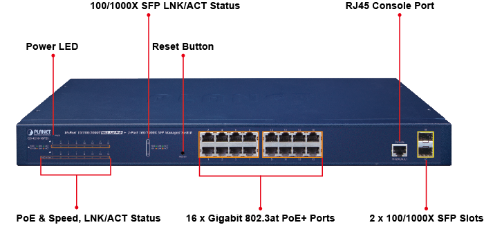 PLANET GS-4210-16P2S es un switch PoE Gigabit ideal que ofrece una ventaja rentable para la red de área local y es ampliamente aceptado en la red de oficinas de PYMES. Ofrece funciones inteligentes de conmutación y administración de paquetes de datos de Capa 2, una interfaz de usuario web amigable y un funcionamiento estable. El modelo cumple con IEEE 802.3at Power over Ethernet Plus (PoE+) a un precio asequible. El GS-4210-16P2S está equipado con 16 puertos Gigabit Ethernet 10/100/1000BASE-T y 2 interfaces SFP 100/1000BASE-X con sistema de alimentación interno. Sus 16 puertos Gigabit Ethernet están integrados con la función de inyector PoE+ 802.3at en todos los puertos. Ofrece una solución de alimentación segura, confiable, asequible y que se puede montar en bastidor para PYMES que implementan redes Power over Ethernet o que requieren una mejor seguridad de datos y administración del tráfico de red.