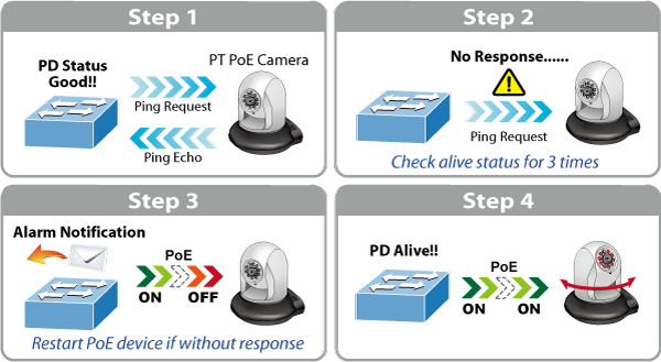 El GS-4210-16P2S se puede configurar para supervisar el estado del PD (dispositivo alimentado) conectado en tiempo real mediante una acción de ping. Una vez que el PD deja de funcionar y responder, el GS-4210-16P2S reanudará la alimentación del puerto PoE y hará que el PD vuelva a funcionar. Mejorará en gran medida la fiabilidad de la red a través del puerto PoE que restablece la fuente de alimentación del PD y reduce la carga de gestión del administrador.