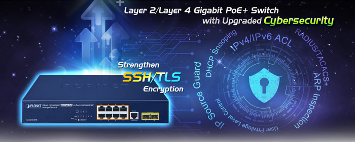 Además, el GS-4210-8P2S ofrece administración remota segura al admitir conexiones SSHv2, TLSv1.2 y SNMP v3 que cifran el contenido del paquete en cada sesión.