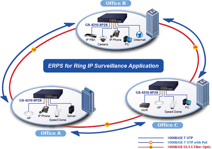 El GS-4210-8P2S admite la tecnología de anillo redundante y cuenta con una capacidad de autorrecuperación rápida y sólida para evitar interrupciones e intrusiones externas. Incorpora tecnología avanzada ITU-T G.8032 ERPS (Ethernet Ring Protection Switching), protocolo Spanning Tree (802.1s MSTP) en la red del cliente para mejorar la confiabilidad del sistema y el tiempo de actividad en varios entornos.