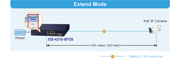 En el modo de funcionamiento "Extendido", el GS-4210-8P2S funciona por puerto a una velocidad dúplex de 10 Mbps, pero puede admitir una salida de alimentación PoE de 20 vatios a una distancia de hasta 250 metros, superando el límite de 100 m del cable UTP Ethernet. Con esta nueva característica, el GS-4210-8P2S proporciona una solución adicional para la extensión de la distancia PoE 802.3at/af, ahorrando así el coste de la instalación del cable Ethernet.