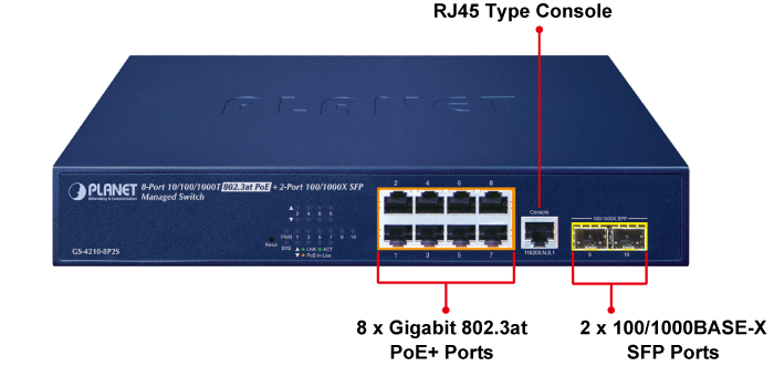 PLANET GS-4210-8P2S es un conmutador PoE+ Gigabit administrado de tamaño de escritorio y optimizado en cuanto a costos que incluye funciones PoE inteligentes PLANET para mejorar la disponibilidad de aplicaciones empresariales críticas. Proporciona administración de doble pila IPv6/IPv4 y un motor de conmutación Gigabit L2/L4 integrado junto con 8 puertos 10/100/1000BASE-T con PoE+ 802.3at de 30 vatios y 2 ranuras de fibra SFP 100/1000BASE-X adicionales. Con un presupuesto de energía total de hasta 140 vatios para diferentes tipos de aplicaciones PoE, proporciona una solución de red Power over Ethernet rápida, segura y rentable para pequeñas empresas y grandes empresas.