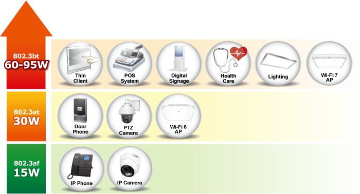 Como el GS-4210-24UP4X adopta la tecnología estándar IEEE 802.bt PoE++, es capaz de suministrar hasta 95 vatios de alimentación mediante el uso de los cuatro pares de cableado Ethernet Cat5e/6 estándar para suministrar alimentación y datos a máxima velocidad a cada dispositivo alimentado (PD) compatible con PoE remoto. Su capacidad de potencia es tres veces mayor que la del PoE+ 802.3at convencional y es una solución ideal para los PD de red que consumen mucha energía, como: