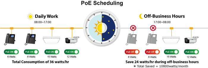 En el marco de la tendencia mundial de ahorro de energía y contribuyendo a la protección del medio ambiente, el GS-4210-24UP4X puede controlar eficazmente la fuente de alimentación, además de su capacidad de brindar una alta potencia en vatios. La función “Programación PoE” le ayuda a habilitar o deshabilitar la alimentación de energía PoE para cada puerto PoE durante intervalos de tiempo específicos y es una función poderosa para ayudar a las PYMES o empresas a ahorrar energía y dinero. También aumenta la seguridad al apagar los dispositivos de almacenamiento que no deberían estar en uso fuera del horario comercial.