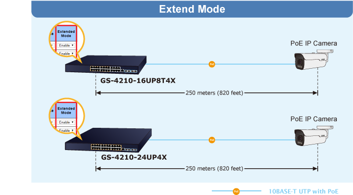 En el modo de funcionamiento "Extendido", el GS-4210-24UP4X funciona por puerto a una velocidad dúplex de 10 Mbps, pero puede admitir una salida de alimentación PoE de 50 vatios a una distancia de hasta 250 metros, superando el límite de 100 m del cable UTP Ethernet. Con esta nueva función, el GS-4210-24UP4X proporciona una solución adicional para la extensión de la distancia PoE 802.3at/af, ahorrando así el coste de la instalación del cable Ethernet.