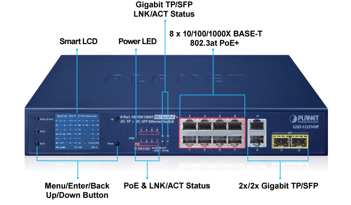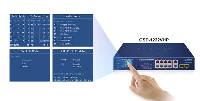 PLANET GSD-1222VHP ofrece un panel de color intuitivo en su panel frontal que facilita la gestión de Ethernet y la gestión de PD PoE. Promueven en gran medida la eficiencia de la gestión en redes a gran escala para empresas, hoteles, centros comerciales, edificios gubernamentales y otras áreas públicas, y cuentan con las siguientes funciones especiales de gestión y estado: