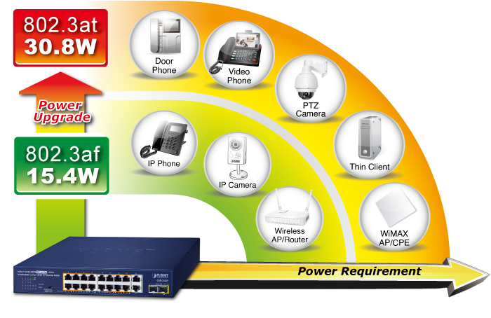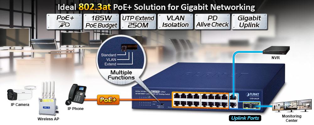 Para facilitar las aplicaciones de red con alimentación PoE de 32 W con transmisión a velocidad Gigabit, el GSD-2022P está equipado con 16 puertos Gigabit Ethernet 10/100/1000BASE-T, 2 puertos Gigabit TP adicionales y 2 interfaces SFP 1000BASE-X con el sistema de alimentación interno. Con un total de 185 vatios de presupuesto PoE, cuenta con capacidades Gigabit IEEE 802.3af PoE (hasta 15,4 W) y IEEE 802.3at PoE+ (hasta 32 W) de alto rendimiento en todos los puertos.