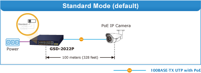 Con esta nueva función, el GSD-2022P proporciona una solución adicional para la extensión de distancia PoE+ 802.3at, ahorrando así el coste de instalación del cable Ethernet.