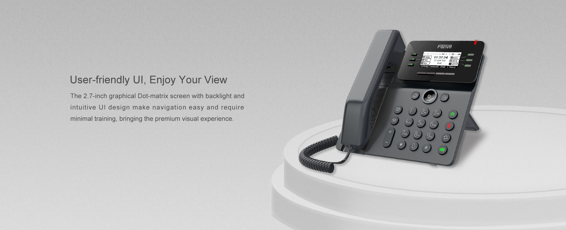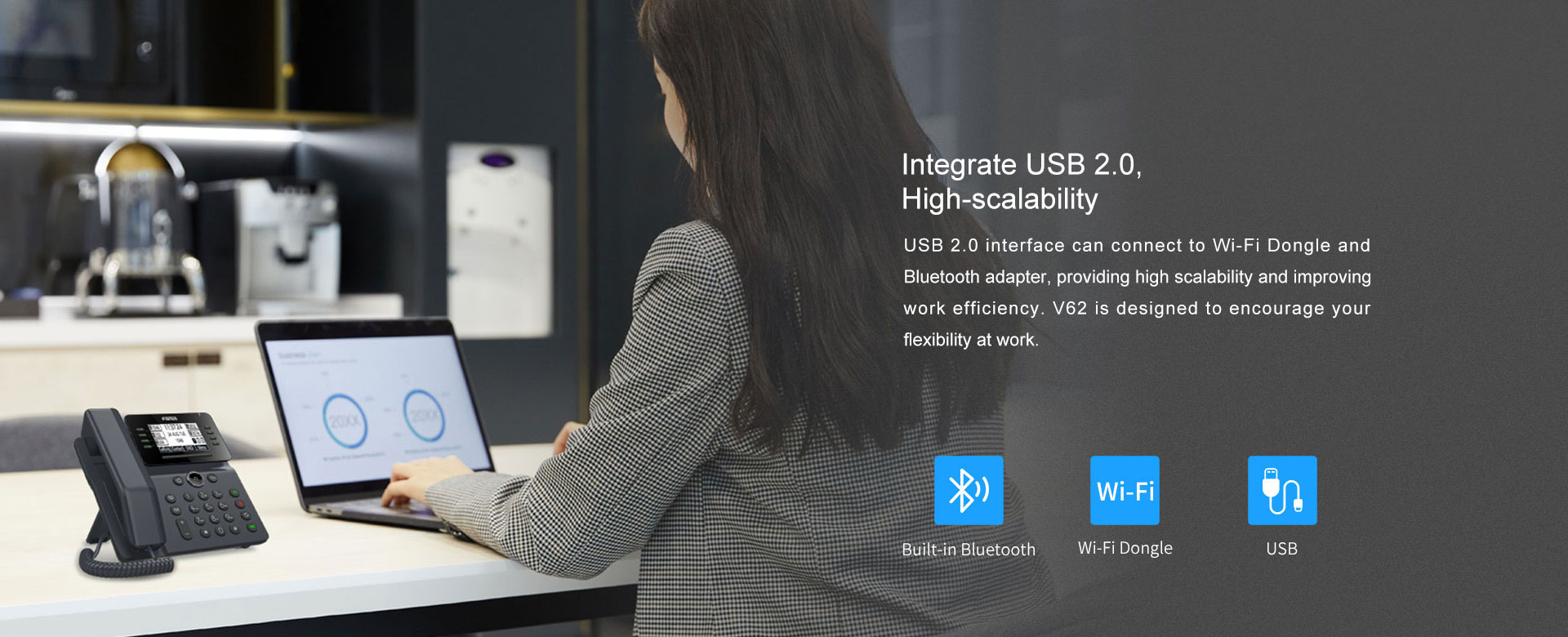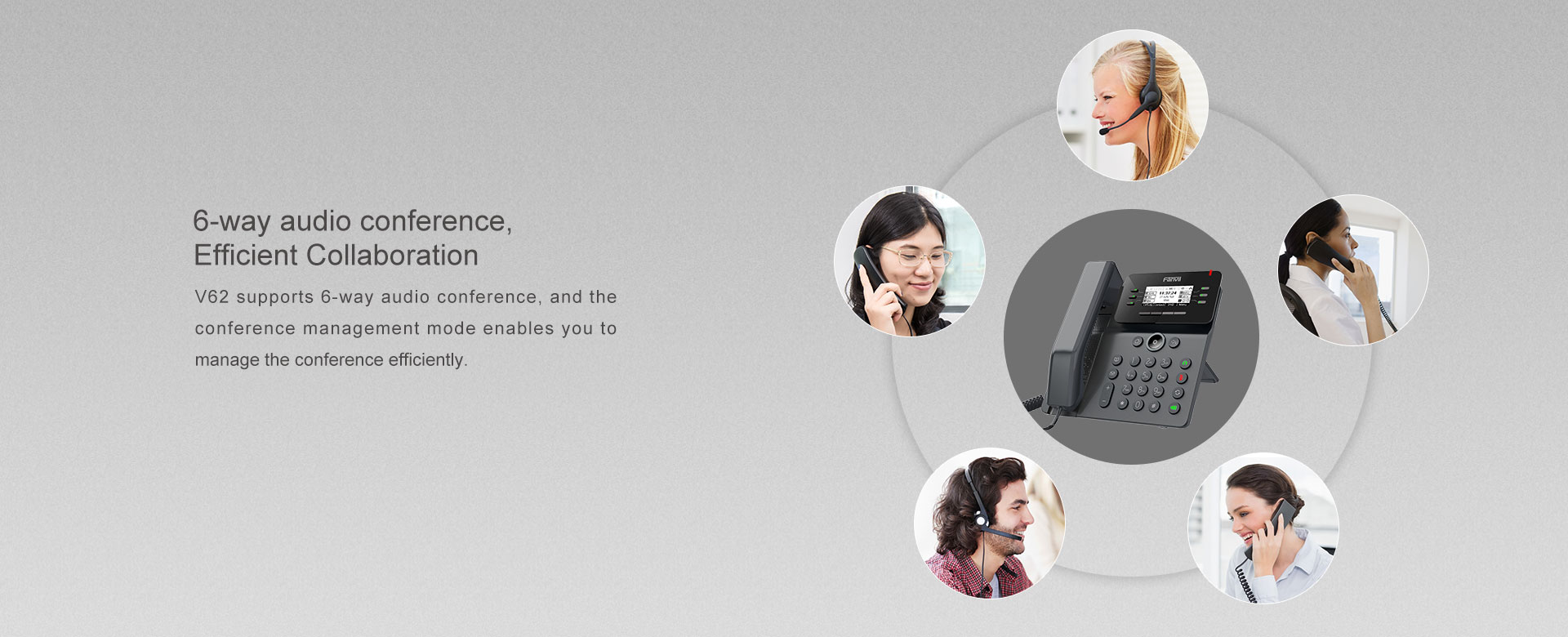 El V62 es más que un teléfono eficiente, es una delicada obra de arte, que proporciona una experiencia de comunicación empresarial inteligente y fluida para las empresas. Como el teléfono de negocios esencial con una pantalla gráfica de matriz de puntos con retroiluminación y las funciones VoIP necesarias y otras características extendidas, V62 es una excelente combinación de elegante exterior y potente interior.