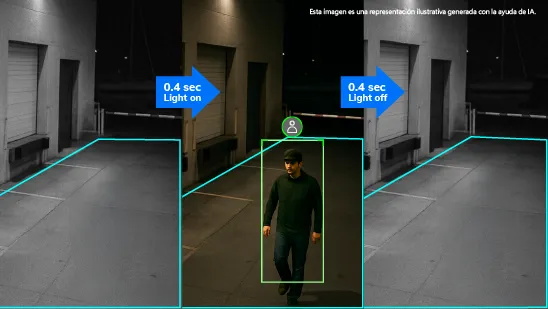 Esta función garantiza una visualización clara y detallada de personas o vehículos, incluso cuando están en movimiento o en condiciones de poca luz, gracias al motor RealSight, que ofrece imágenes nítidas sin sobreexposición de forma automática, incluso de noche, cuando la luz cálida está encendida.