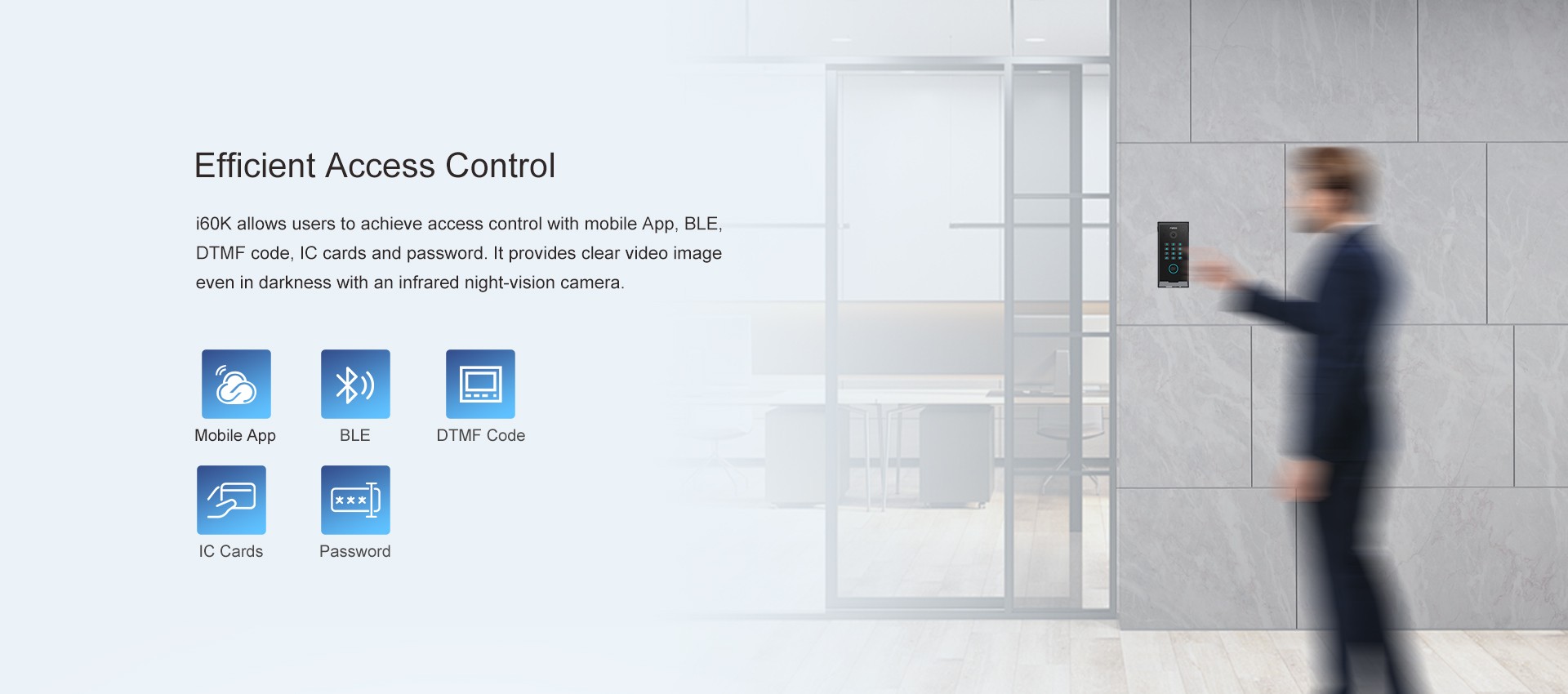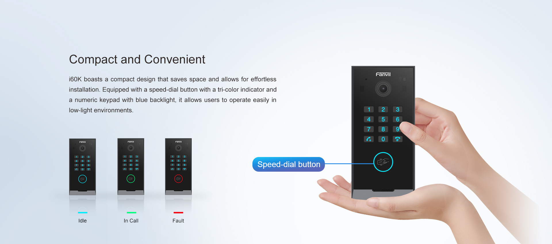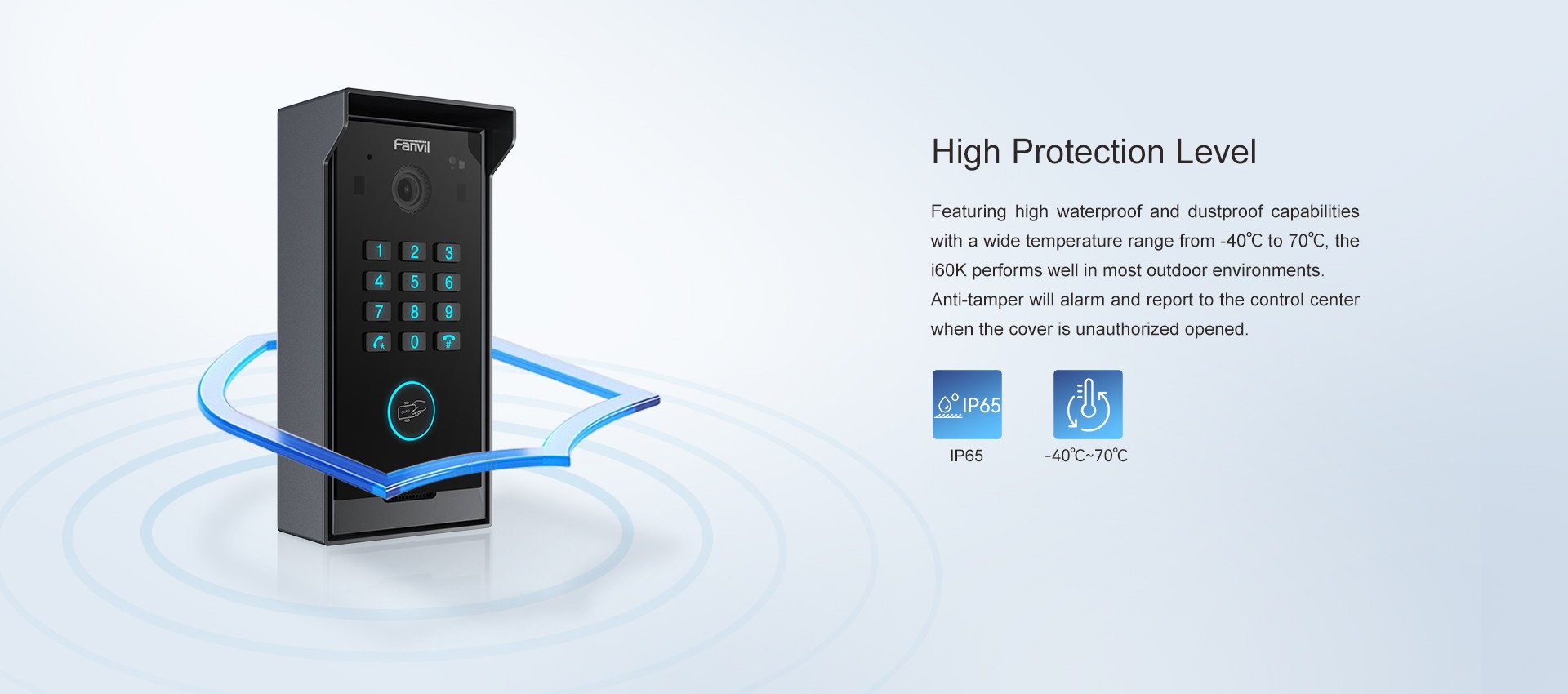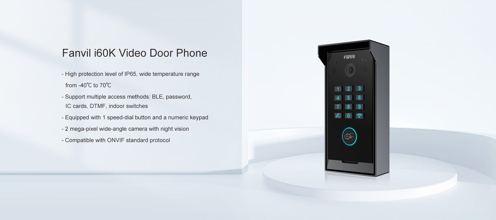 El Fanvil i60K es un videoportero con botón de marcación rápida, teclado numérico y clasificación IP65 para uso en interiores y exteriores. Admite varios métodos de apertura de puertas, como contraseña, BLE, tarjetas IC, DTMF remoto e interruptores interiores para una gestión de acceso optimizada y está equipado con una cámara de 2 megapíxeles para comunicación de audio y video. Compatible con SIP y ONVIF, se integra con sistemas de seguridad y es ideal para villas, departamentos y comunidades.