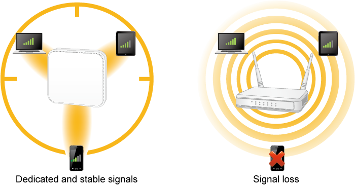 El WDAP-C3000AX se puede instalar en áreas públicas como puntos de acceso, aeropuertos y conferencias, ya que OFDMA, una versión multiusuario de OFDM, permite que el AP concurrente se comunique (enlace ascendente y descendente) con múltiples clientes asignando subconjuntos de subportadoras llamadas unidades de recursos (RU) a los 0 clientes. Con las tecnologías MU-MIMO y Seamless Roaming, se proporciona una mejor experiencia de usuario de Wi-Fi, lo que reduce la probabilidad de que los usuarios apaguen el Wi-Fi y pongan más carga en la red celular. Beamforming sirve para mejorar la señal de Wi-Fi cuando se está lejos del enrutador. El color BSS es un identificador numérico del BSS. Las radios 802.11ax pueden diferenciar entre BSS utilizando el identificador de color BSS cuando otras radios transmiten en el mismo canal.