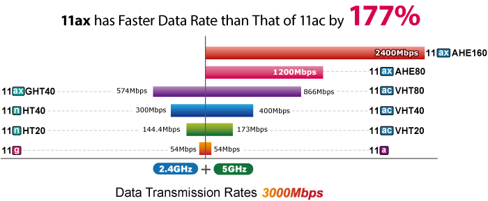 PLANET WDAP-C3000AX, que adopta el estándar IEEE 802.11ax Wi-Fi 6, proporciona una transmisión de alta velocidad. La velocidad inalámbrica máxima en la banda de 2,4 GHz es de hasta 11AX de 574 Mbps, y en la banda de 5 GHz es de hasta 11AX de 2402 Mbps. Las conexiones inalámbricas de 2,4 GHz y 5 GHz también se pueden utilizar simultáneamente.