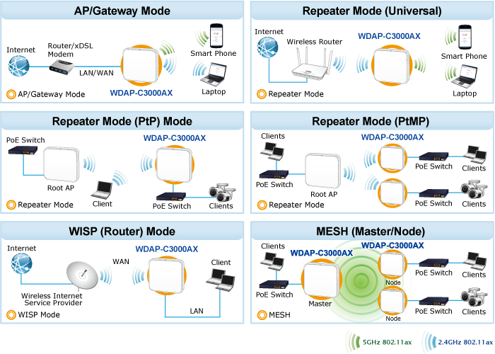 El WDAP-C3000AX admite los modos de uso simplificados de AP, Gateway y Repeater, a través de los cuales proporciona más flexibilidad a los usuarios cuando se establece una red inalámbrica. En comparación con los puntos de acceso inalámbricos generales, el WDAP-C3000AX ofrece una capacidad más potente y flexible para los clientes inalámbricos.