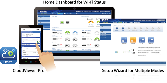 A través de la aplicación PLANET CloudViewerPro, puede supervisar y controlar los puntos de acceso en tiempo real sin una ubicación específica ni una limitación de tiempo. El nuevo asistente de configuración de la interfaz gráfica de usuario ayuda al administrador del sistema a configurar fácilmente el WDAP-C3000AX paso a paso. Además, el analizador de Wi-Fi integrado proporciona la utilización del canal en tiempo real para evitar la superposición de canales y garantizar un mayor rendimiento. Con el mecanismo de potencia de transmisión automática, el control de distancia y la configuración de reinicio programado, el WDAP-C3000AX es fácil de implementar y administrar para el administrador sin necesidad de mantenimiento en el sitio. Además, puede utilizar la función de control de puntos de acceso PLANET NMS-500 o NMS-1000V para entregar perfiles inalámbricos a varios puntos de acceso simultáneamente, lo que simplifica la gestión centralizada.